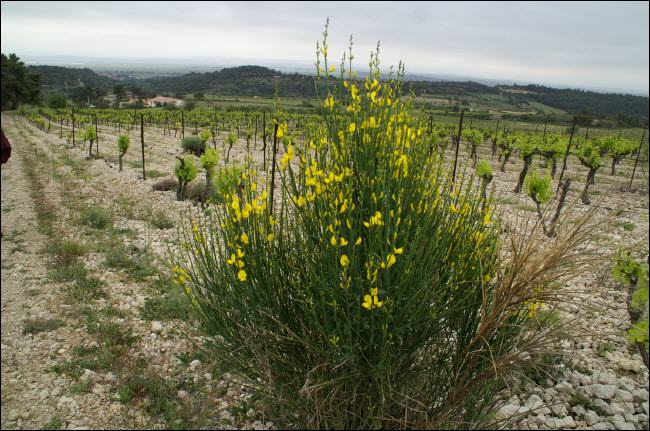 Ginster und Reben im Minervois Ausblick von der Domaine Sainte-Eulalie in La Livinière Richtung Les Corbières und der Pyrenäen.